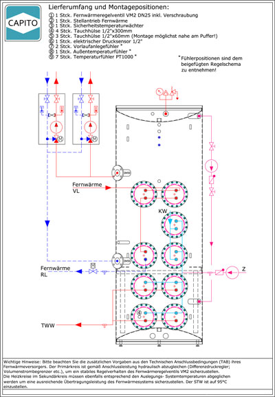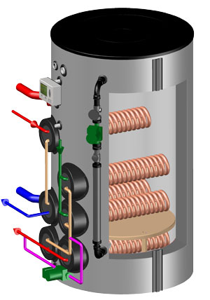Über im Pufferspeicher liegende Systemwärmetauscher wird die Leistung aus dem Wärmeversorgungsnetz direkt in den Pufferspeicher geleitet. Zusätzliche Umwälzpumpen zur Übertragung der Versorgungswärme, wie sie bei konventionellen Platten-Wärmetauscher-Systemen zum Einsatz kommen, entfallen somit. Die erforderlichen Systemparameter werden dabei von der mikroprozessorgesteuerten Regelungseinheit erfasst und optimal ausgeregelt.